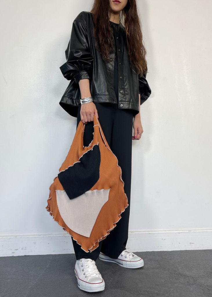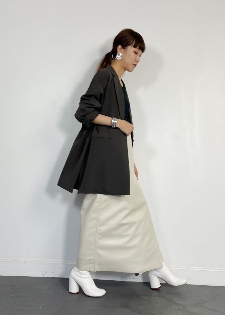 オーバーサイズジャケットに、タイトめなスカートをを合わせる事でバランスよく、ジャケットのサイドスリットやウエストのギャザーが更にメリハリをつけてくれます。