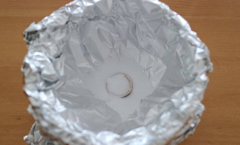 1.耐熱の容器の底面にアルミホイルを敷き、シルバーアクセサリーと重曹を入れて熱湯を注ぎます。