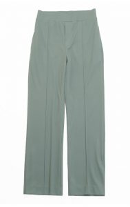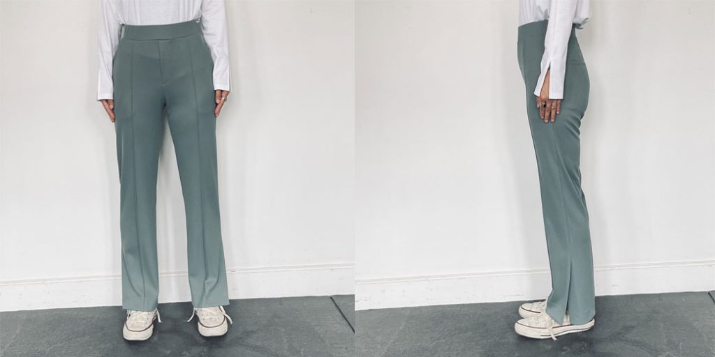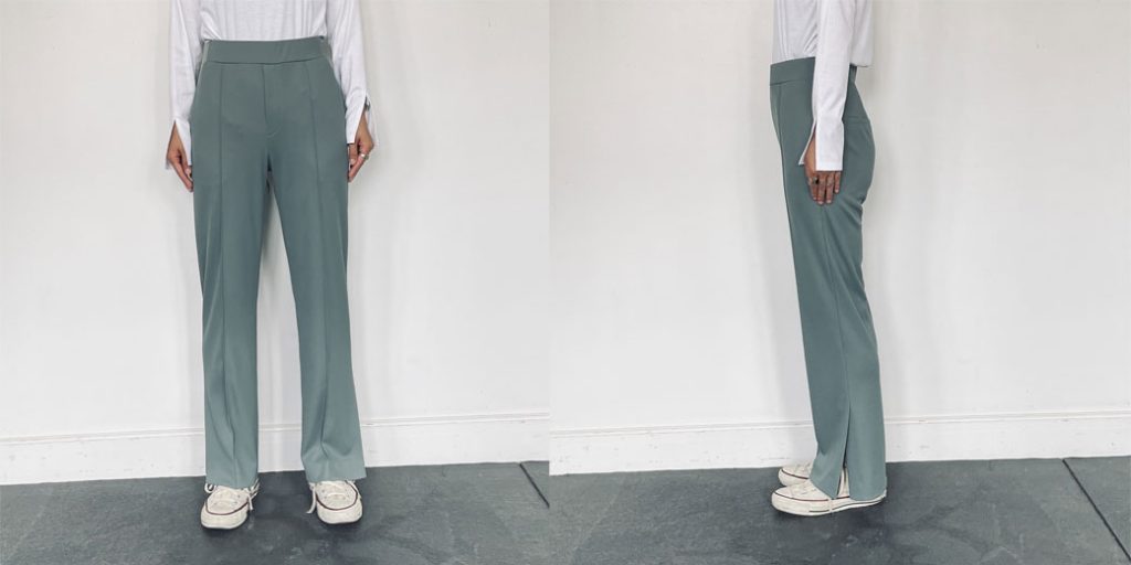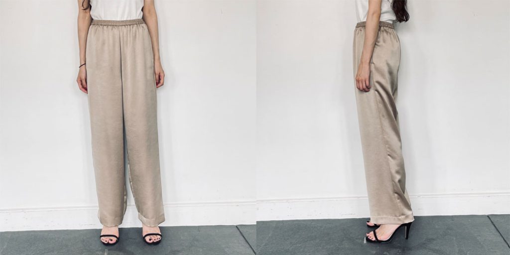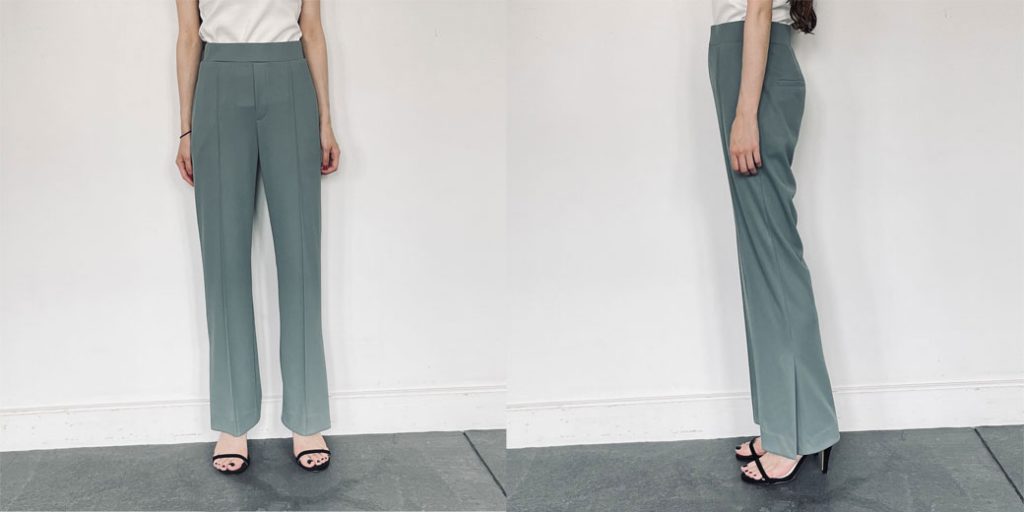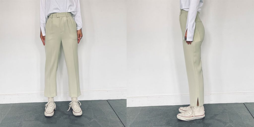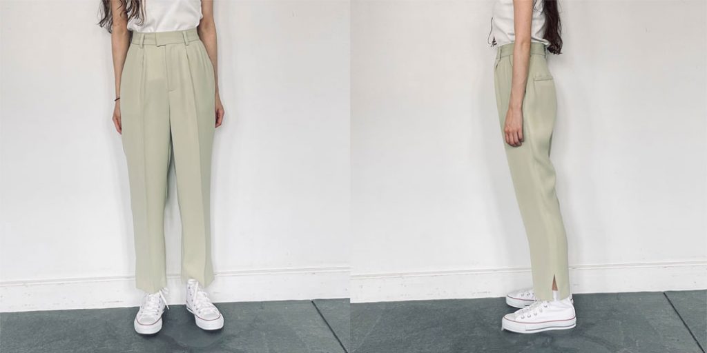くるぶしあたりの丈感。ウエストやヒップ周りに余裕ができたので、わたしは38を選びます。