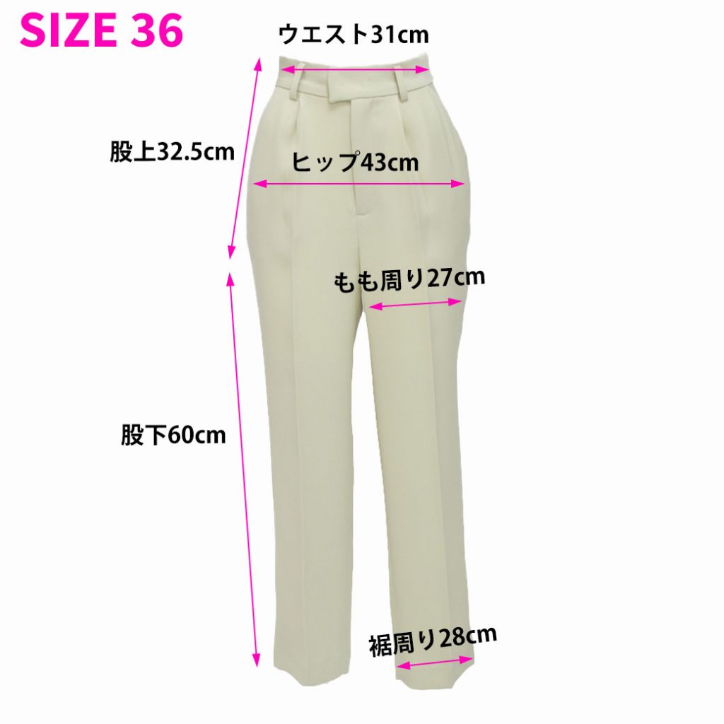 足首くらいの丈感。ウエストなどのサイズ感がOKであれば、38より36の方がよりスッキリとした見た目に。