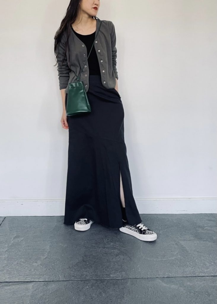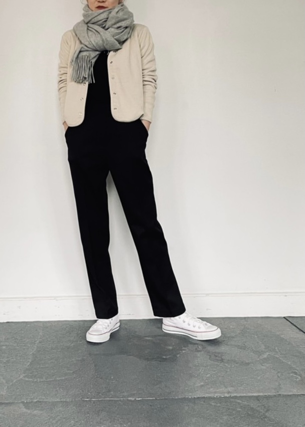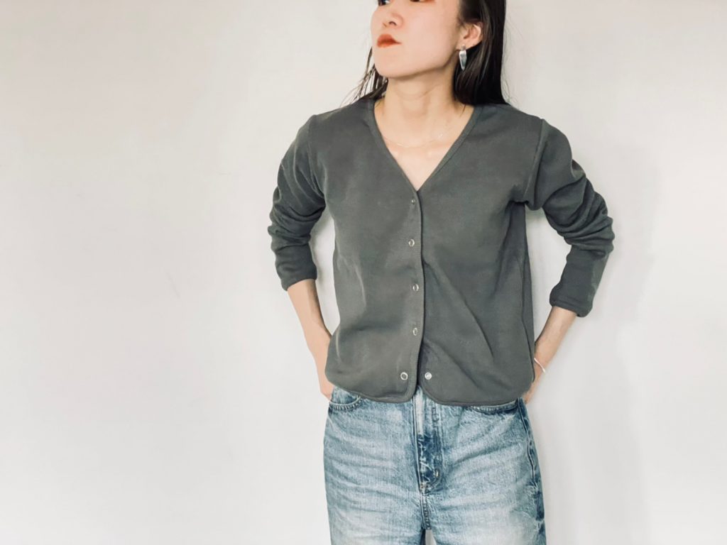 少し厚手のカーディガンと合わせて。