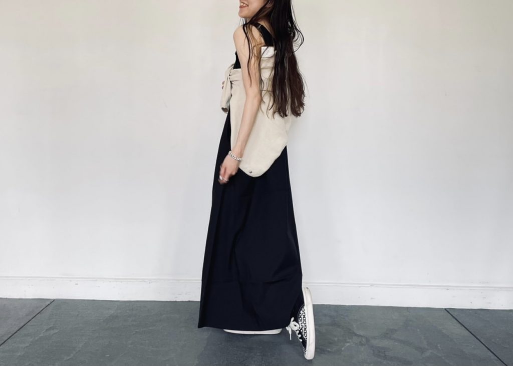 インナー、トップスどちらでも使えるようにバランスを考えたバックシルエットになっています。