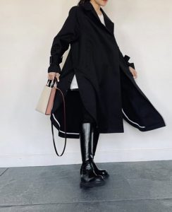 (右)前のボタンを閉めてステンカラーに、ボトムスはスキニーパンツとブーツでかっこよく組み合わせたコーデ。