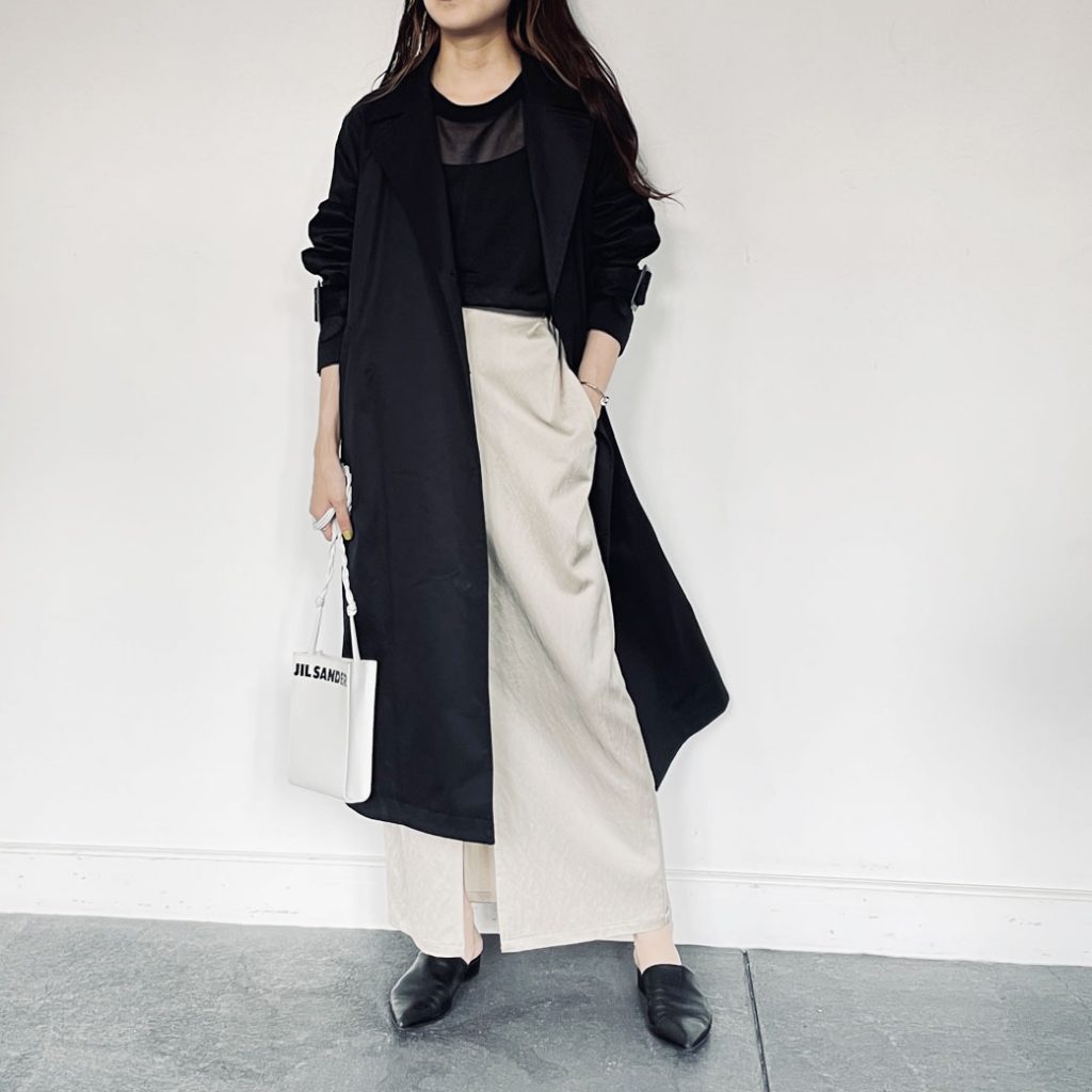 こちらも春・秋と着回しができるおすすめのコーディネート合わせで、オーバーサイズトレンチコートも春秋冬とスリーシーズ着ていただける万能アイテムです!
