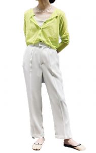 ホワイトパンツ×ライムイエローカラーのトップスをあわせた大人のカラーコーディネート。