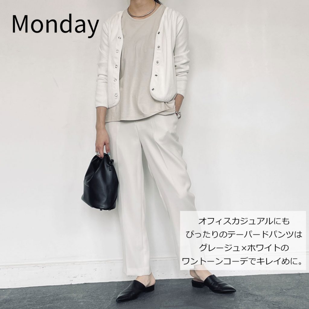 オフィスカジュアルにもぴったりのテーパードパンツは、グレージュ×ホワイトのワントーンコーディネートできれいめに。