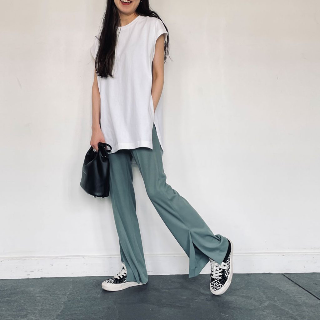 サイドのデザインがスッキリ見えしつつ、白Tシャツでより爽やかな印象に。