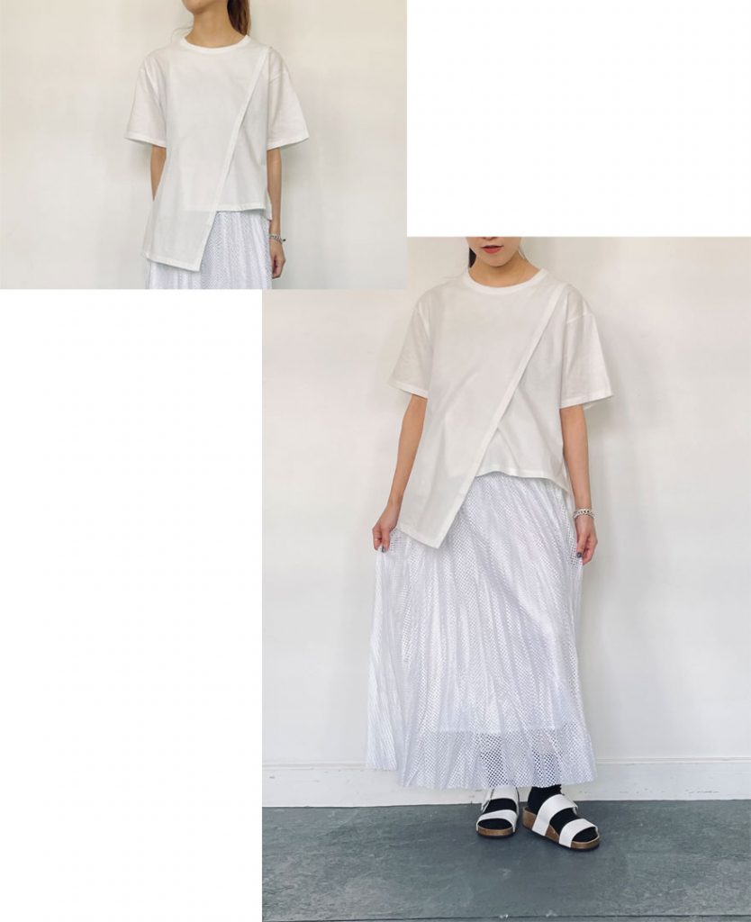 前身頃が重なっているので、白でも透け感を気にせず着用できるのが嬉しいポイント。