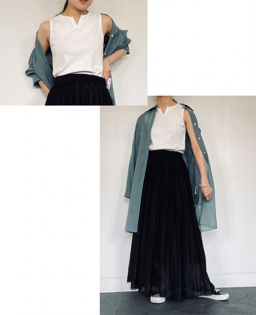 シアーシャツとオーガンジースカートの透け感がある素材同士でより軽やかに◎