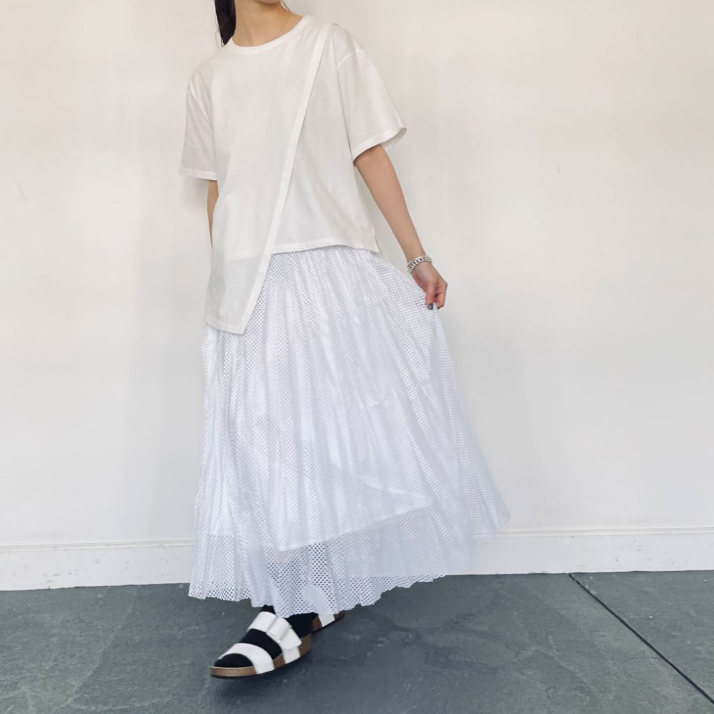 メッシュ素材のホワイトスカート、足元もホワイトサンダルを合わせて