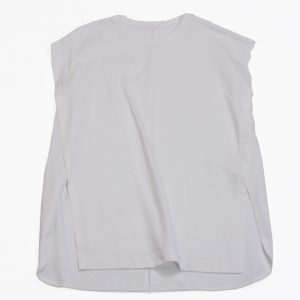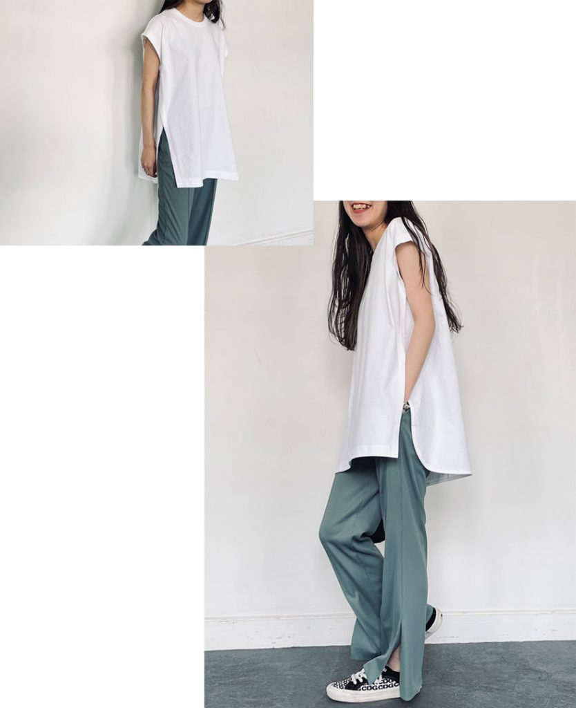 ノースリーブでも、オーバーサイズのため少し袖丈のある白Tシャツ。