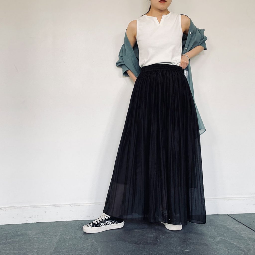 ヘンリーネックを前にオーガンジースカートと合わせた大人のきれいめコーディネート。