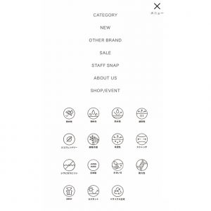 今回のリニューアルでは、オンラインショップのメニュー下部にこのピクトグラムが並んで表示され、気になる機能から商品を探すことができます。(写真右)