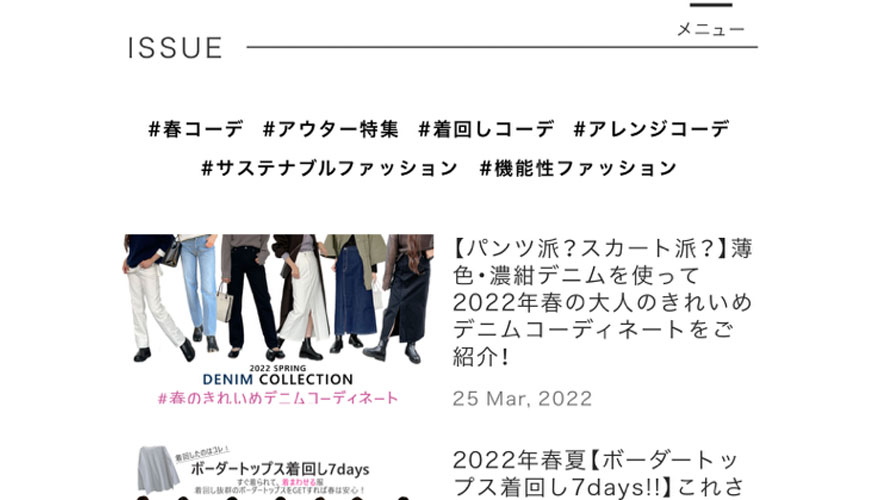 ENTO人気のコンテンツでもあるISSUE(イシュー)特集では、「#春コーデ#着回しコーデ#たすき掛けコーデ」など、興味のあるキーワードから商品を探したい、流行のファッションについて特集記事を参考にしたいというときにもすぐ読むことができるようになりました。