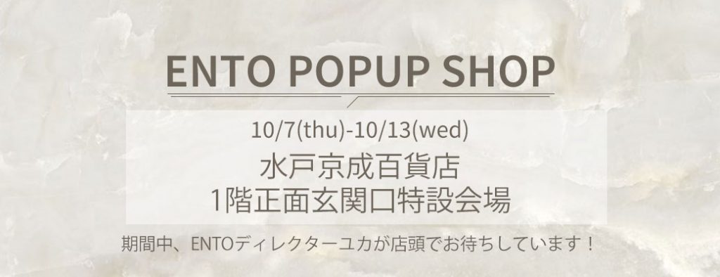 また、期間中はENTOディレクターユカも店頭にてお待ちしておりますので、ぜひお近くにお住いの方は見にいらしてくださいね。