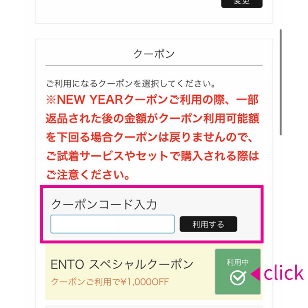 ENTOクーポン横の「クーポンを利用する」をクリックするとグリーンに変わり「利用中」と表示されます。