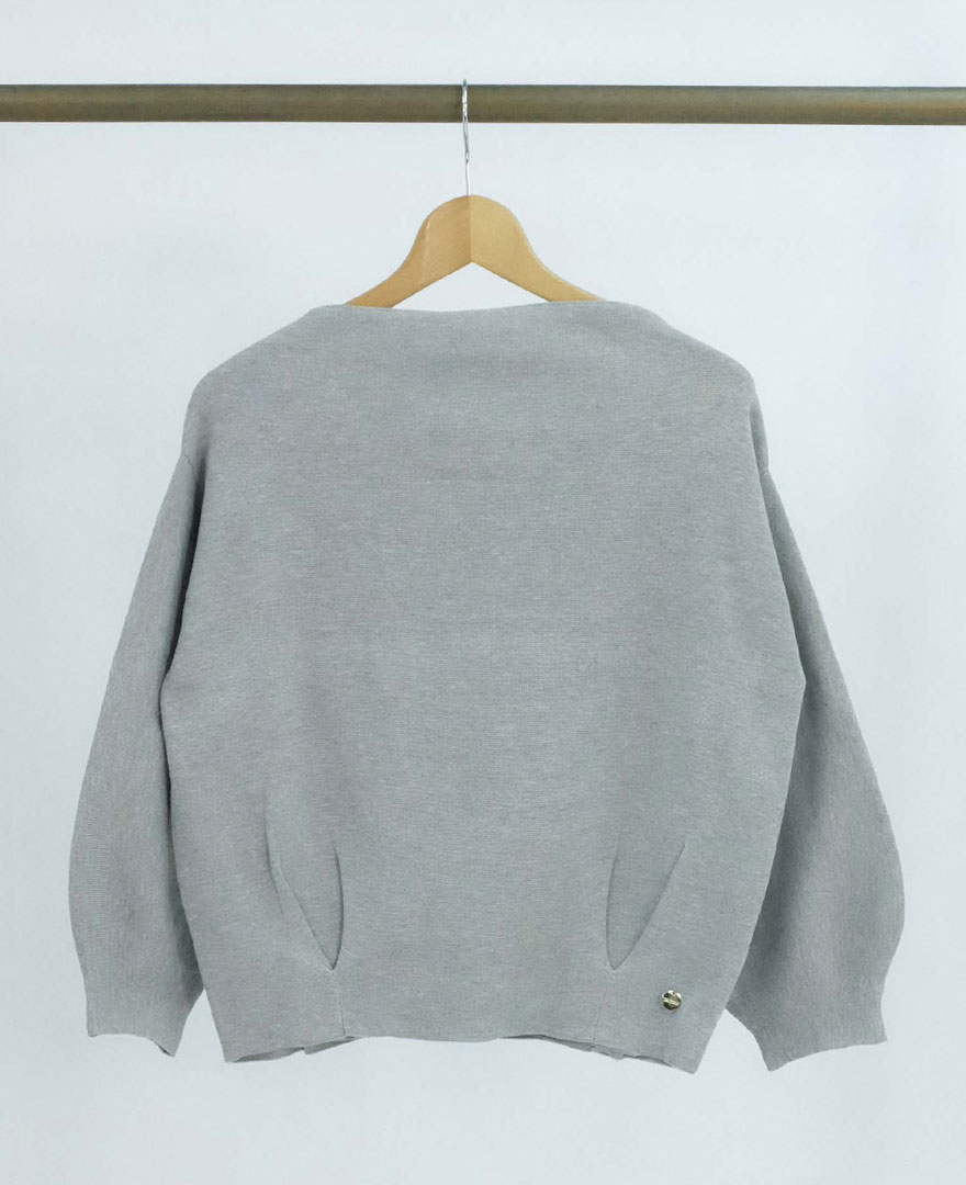 優しげなグレーの春ニットと、足元はピンクゴールドのバレエ メタルを。
