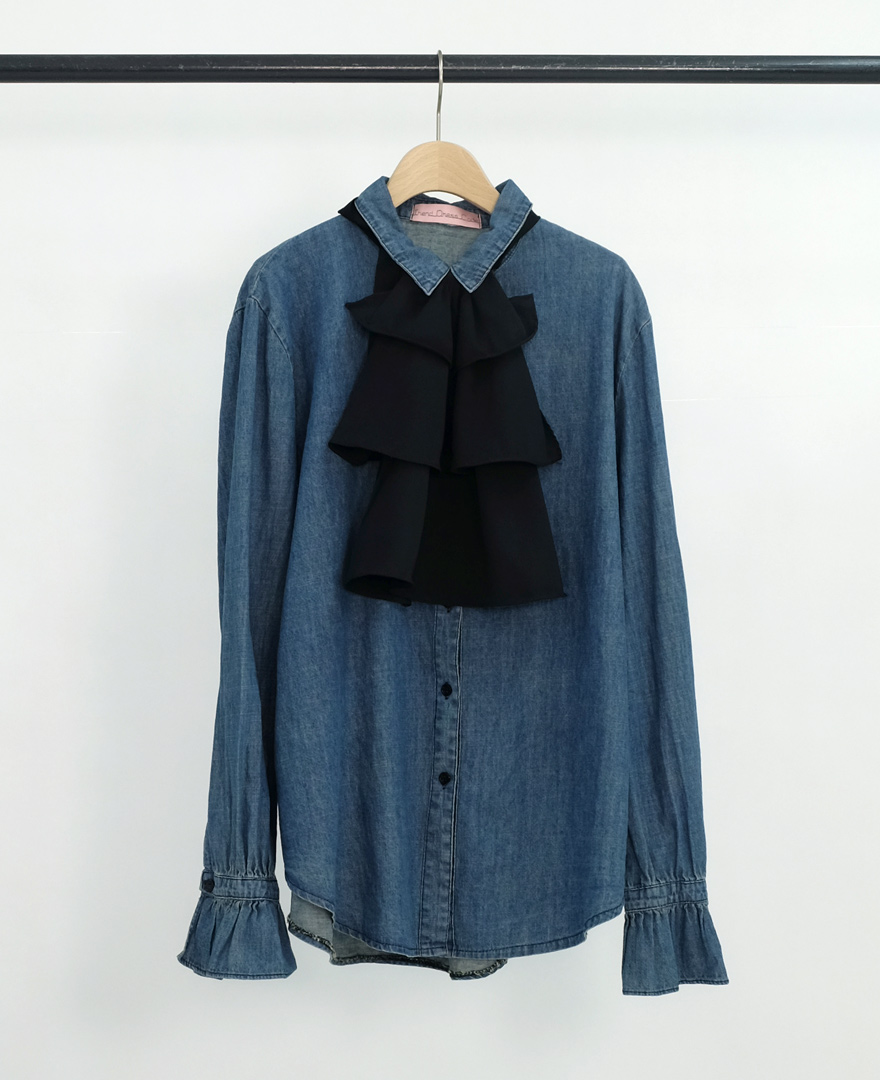 カジュアルなデニムシャツを格上げしてくれるティアードのボウタイが付いたシャツに、