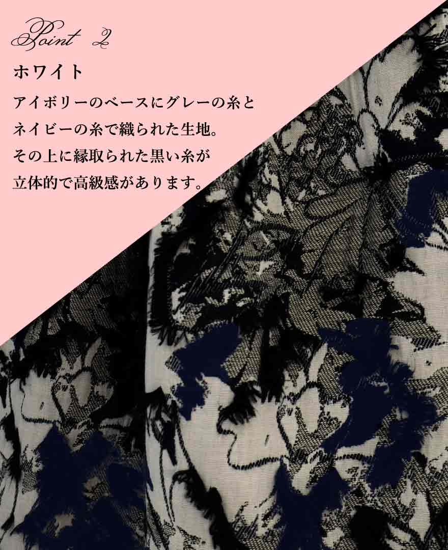 ホワイトはアイボリーがベースのスカート。明るい面積が大きいので、軽やか。グレーとネイビーの糸で織られたジャカード生地に、模様を縁取るような黒い糸が立体的で豪華です。