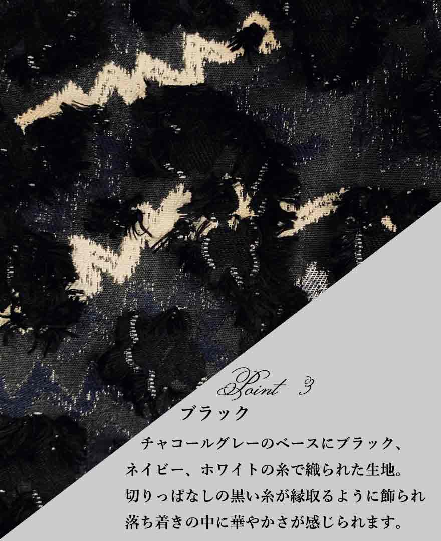ブラックはチャコールグレーがベースで、ブラック、ネイビー、ホワイトの糸で織られたジャカード生地。落ち着いたトーンが好きな方におすすめしたい一枚です。