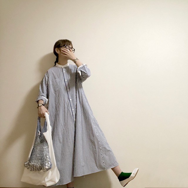 柄物の定番、ストライプワンピースはより清々しさを出す、襟やカフスがホワイトのクレリックできちんと感をプラス。