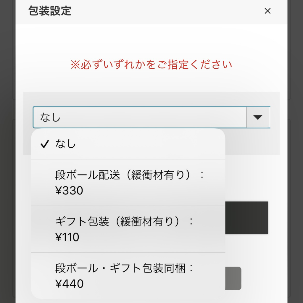 1.カートに入れる画面でギフトラッピングご希望のお客様はギフト資材の『▼』をクリックしてください。