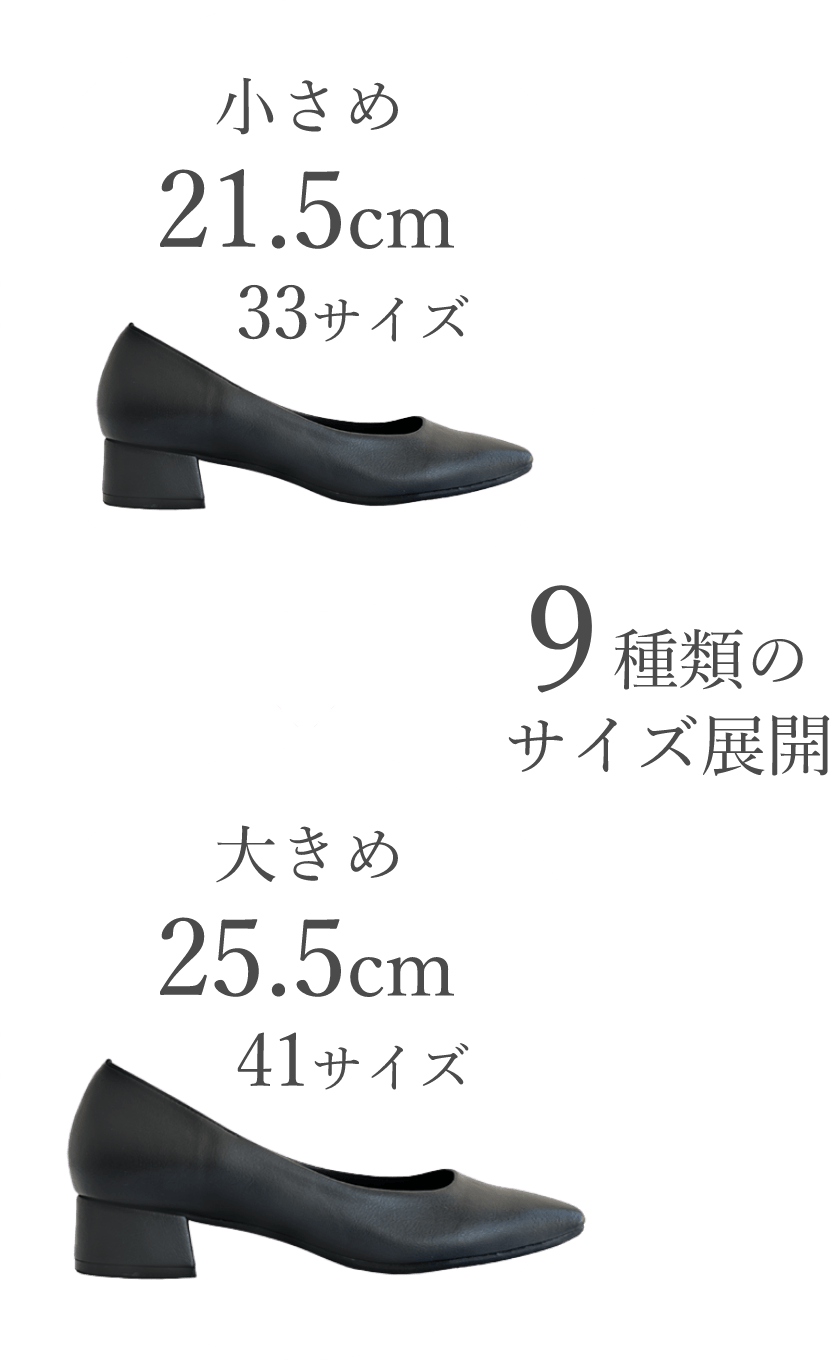 合ったものを選んで サイズについてより多くの方にここちよさを感じて欲しいので、シンデレラサイズの33(21.5cm)から、クイーンサイズの41サイズ(25.5cm)まで、豊富なサイズ展開をご用意しました。