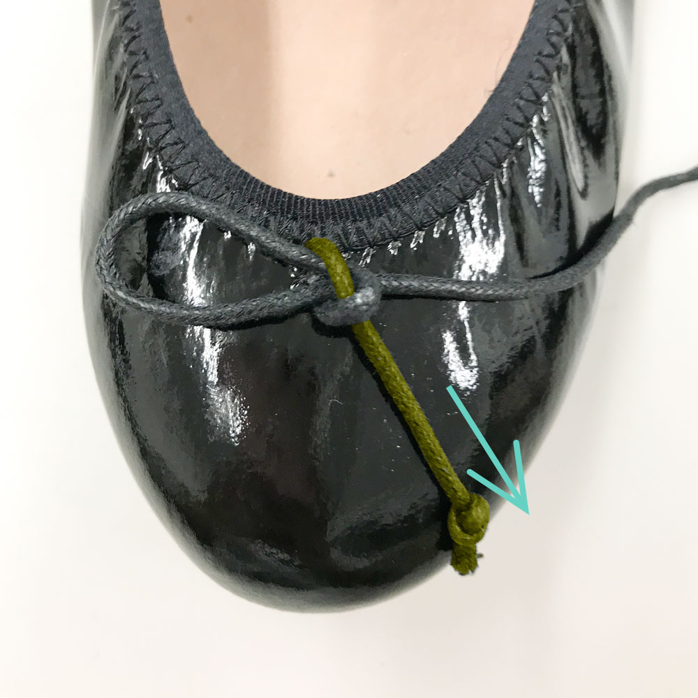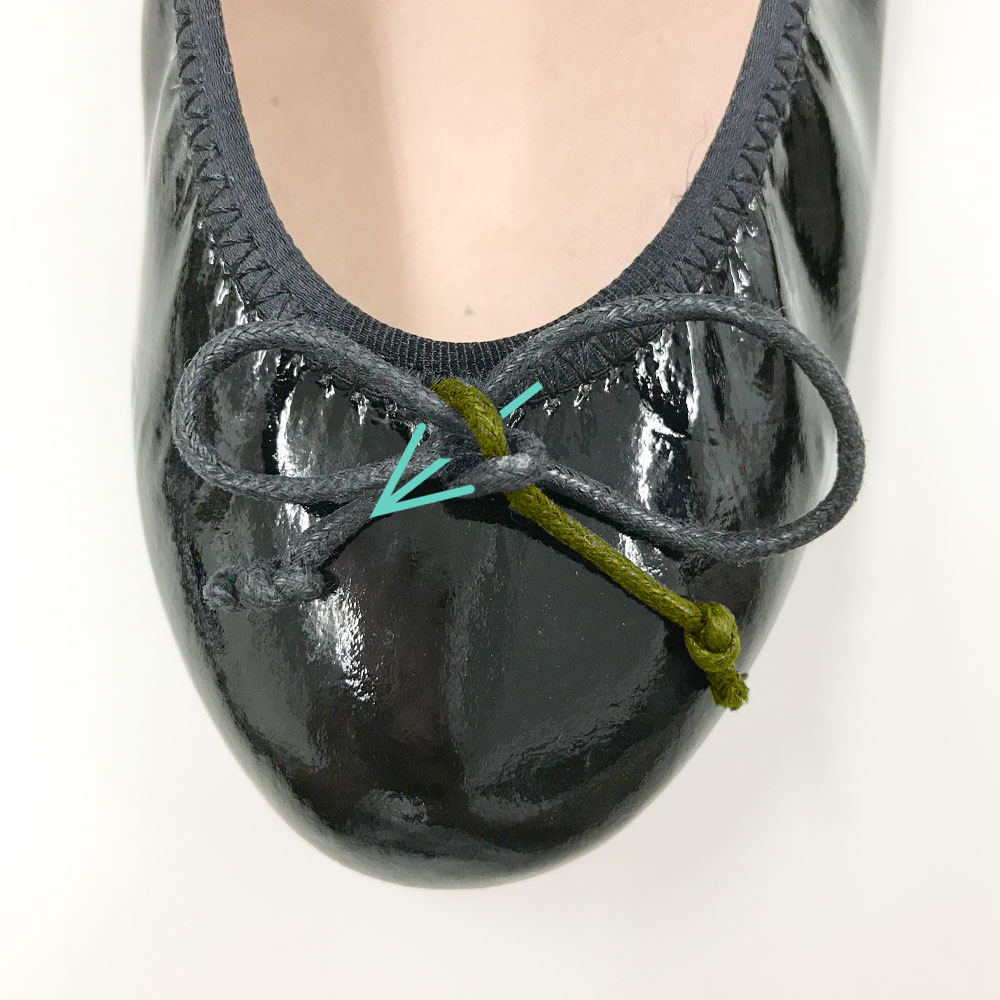 ④長い紐を結び目の一番下にくぐらせます。(〇印部分)