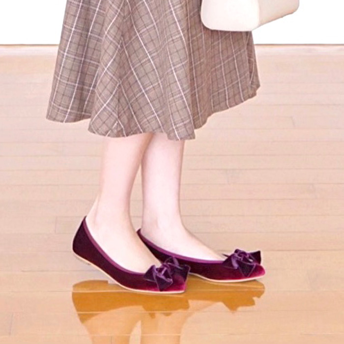 冬は大きなリボンが愛らしいベロアのポインテッドトゥパンプスで引き締めます。