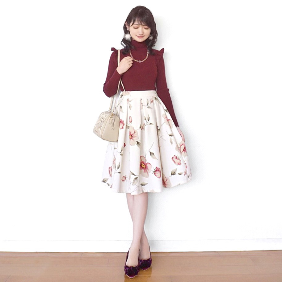 冬だけど春を感じさせる大きなフラワープリントのフレアスカートと合わせました。