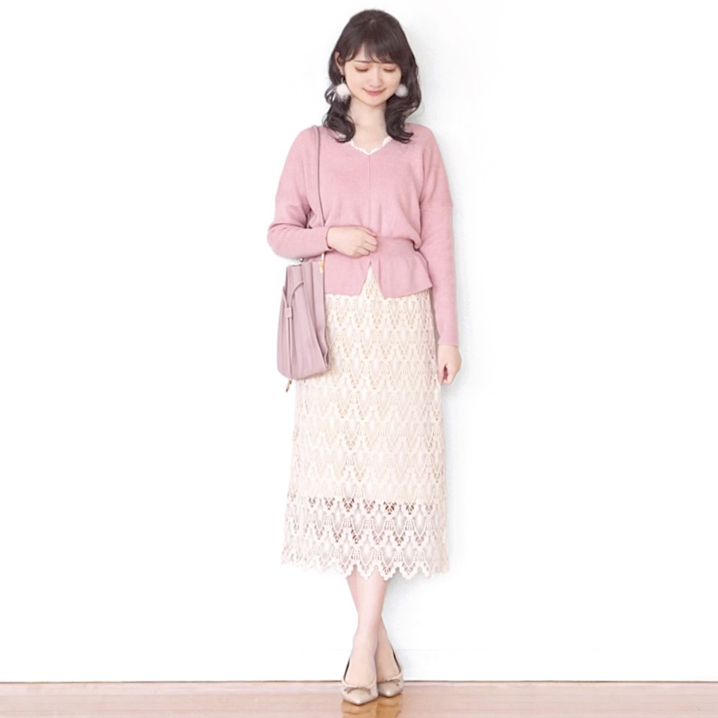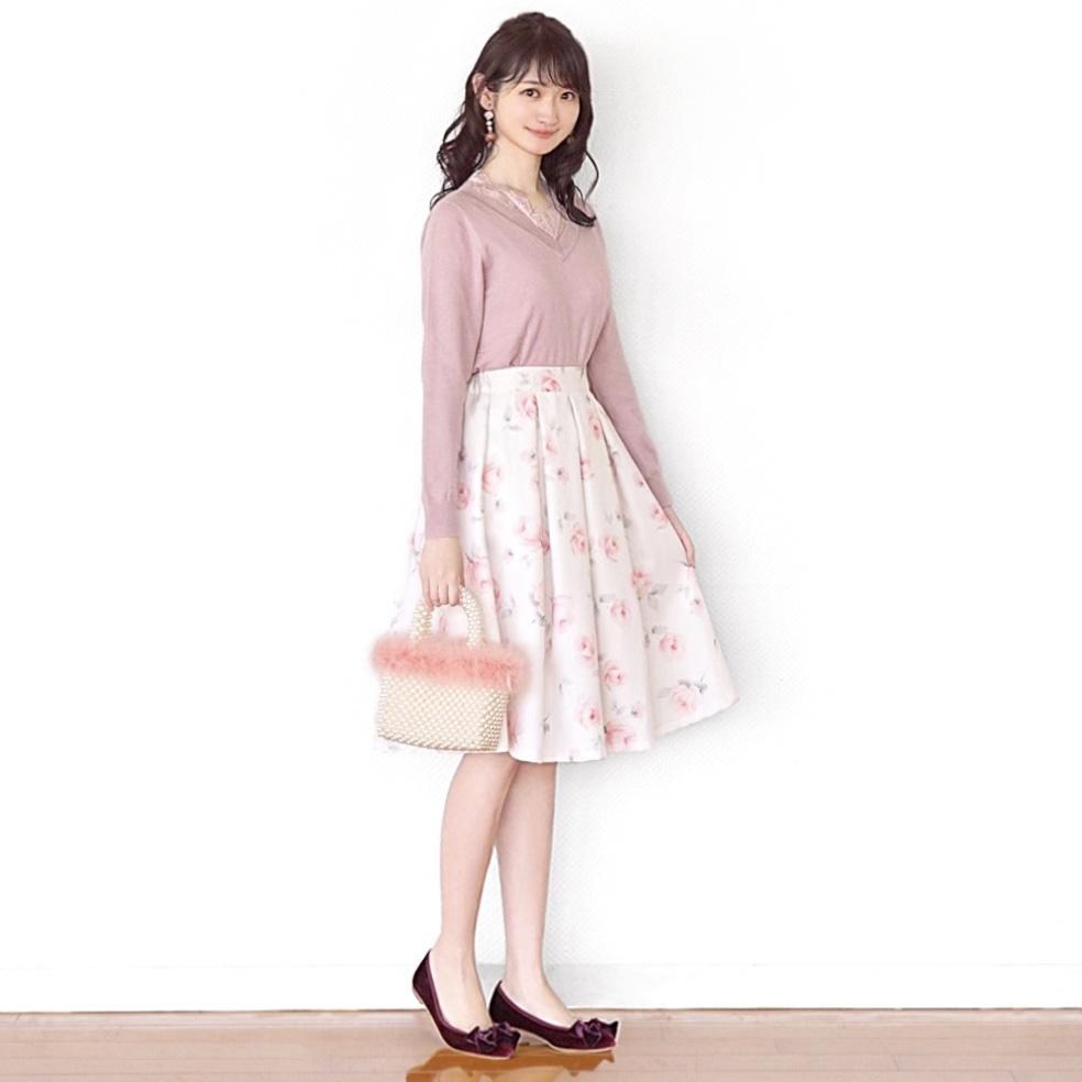 柔らかパステルピンクのVネックニットに、きれいなシルエットのお花柄フレアスカートを合わせました。