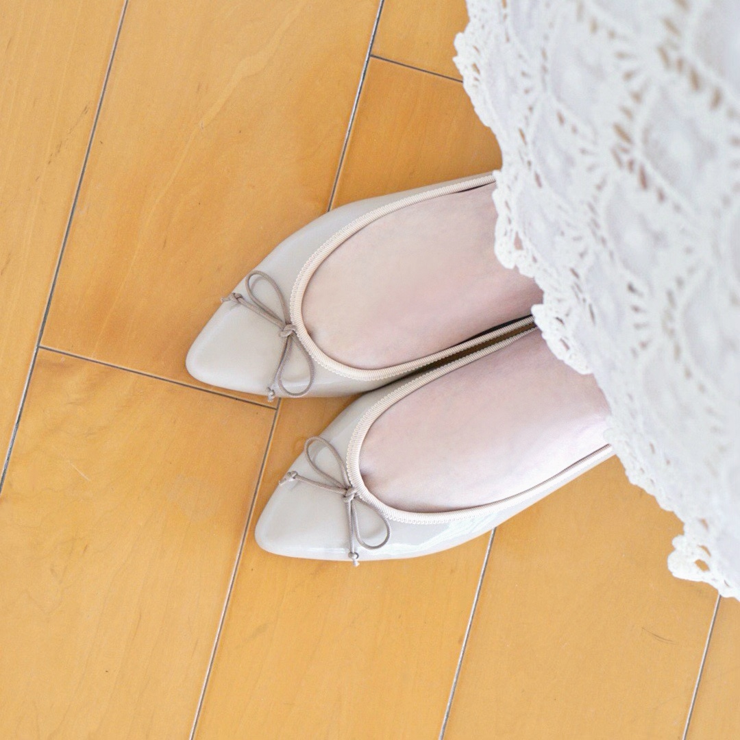 レースのタイトスカートに合わせてベージュのエナメルバレエシューズを選びました。