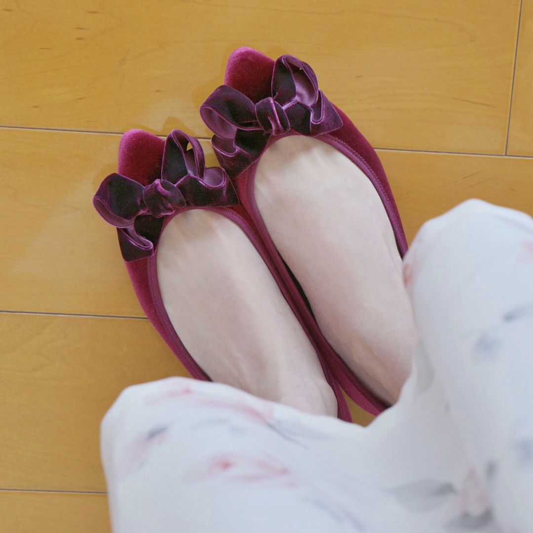クラシカルな雰囲気に合わせてシックなワインカラーのベロア素材パンプスを合わせました。 ワンピースのリボンを手持ちのパールネックレスに変えても可愛いだろうなぁ・・・