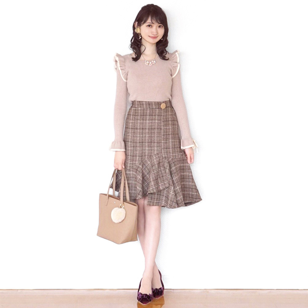 フリルデザインがとても可愛いチェックアシメフレアスカートは コーデのアクセントになるし、着回しがしやすくて重宝しているアイテムです。