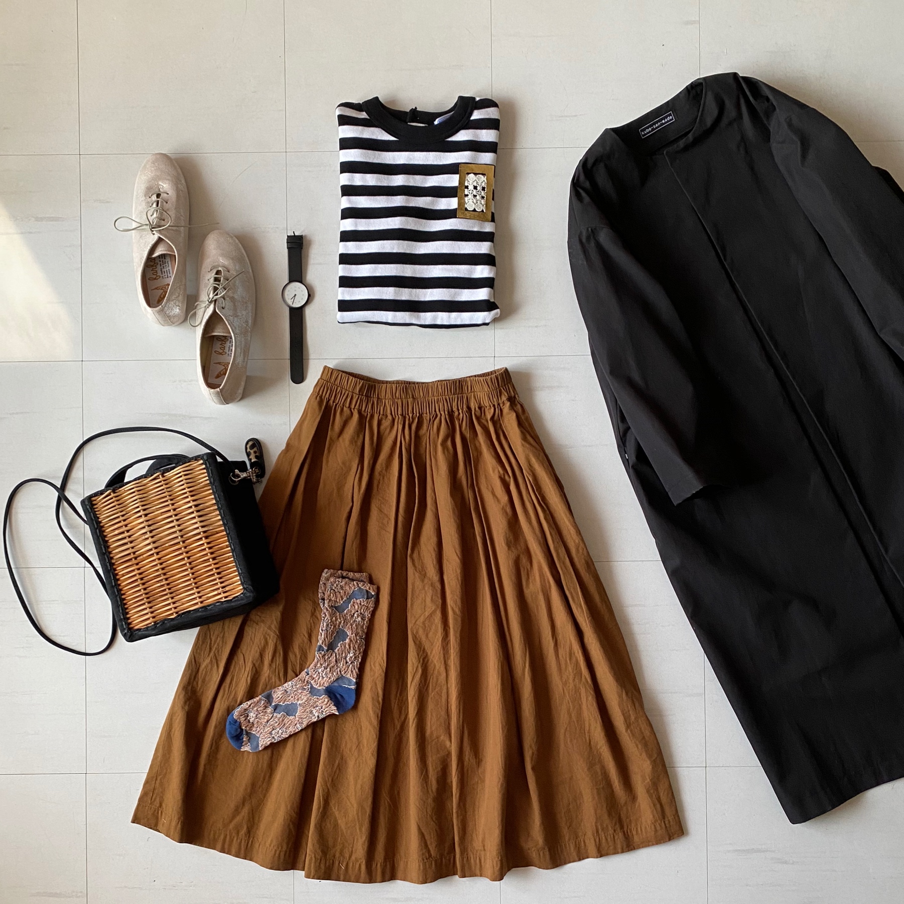 キャメルスカートと白黒ボーダー、