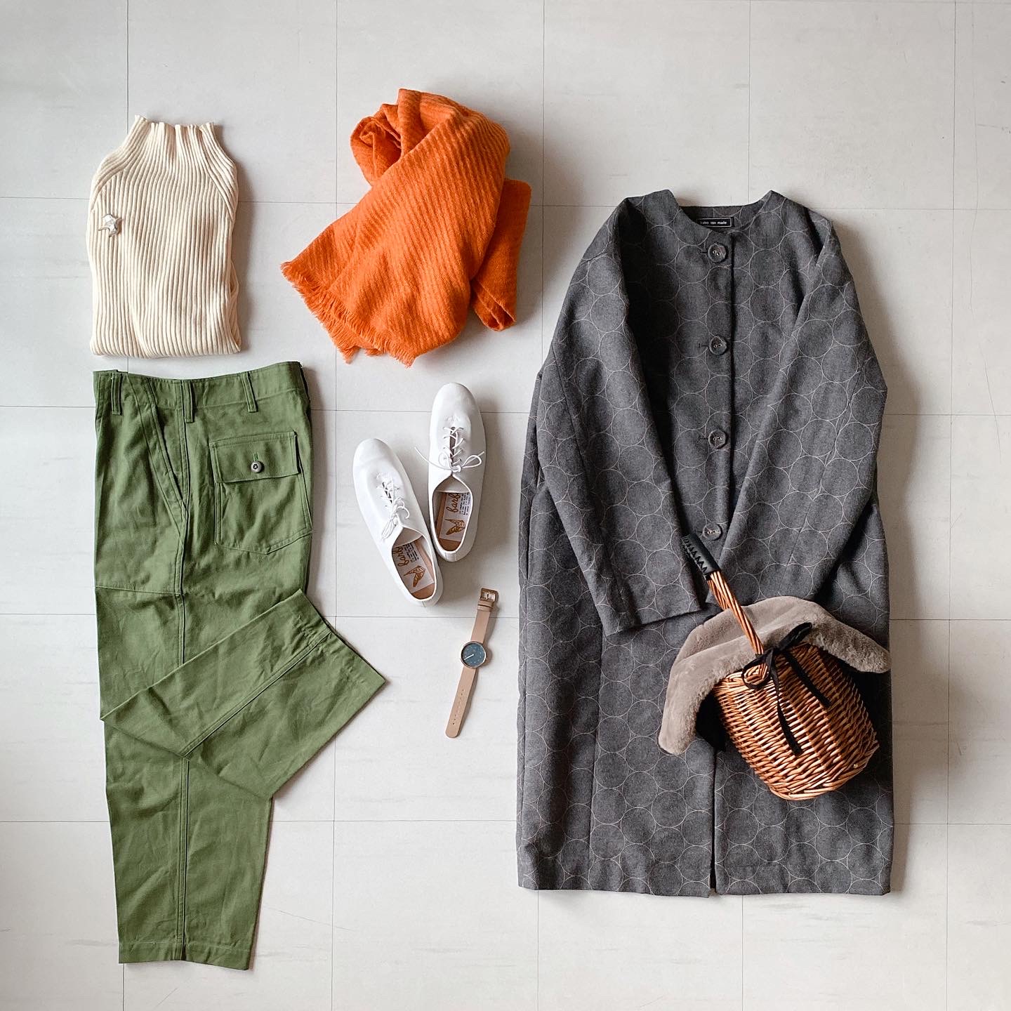 カジュアルなカーゴパンツを使ったコーデは コクーンシルエットのコートとキチンとしたレースアップシューズで 全体のバランスを整えます。