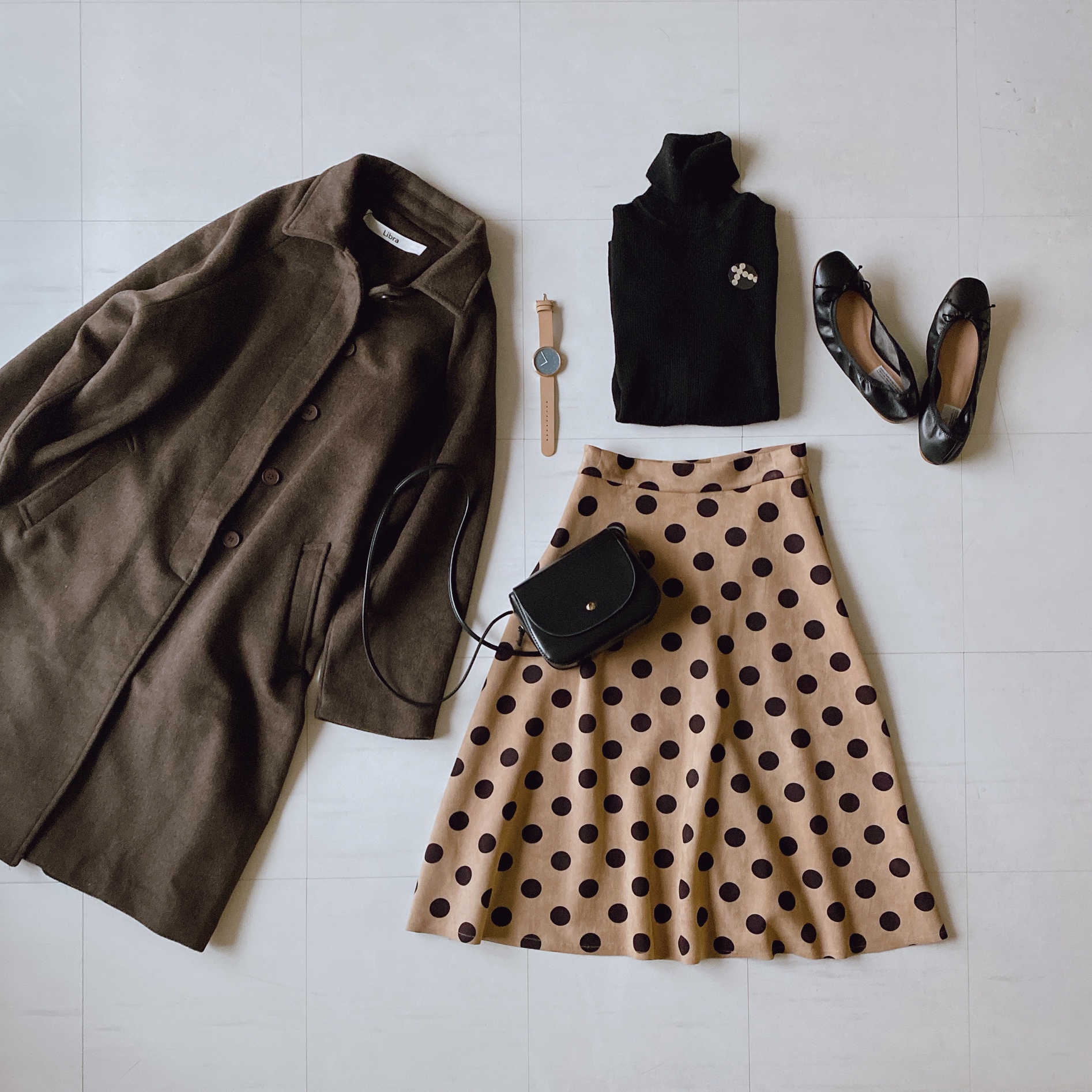 ベージュ地にブラックのドットが入ったレトロっぽいフレアスカートは ハイネックとシンプルなコート、そしてスクエアトゥのバレエシューズで フランスの女優さんのようなスタイルに。