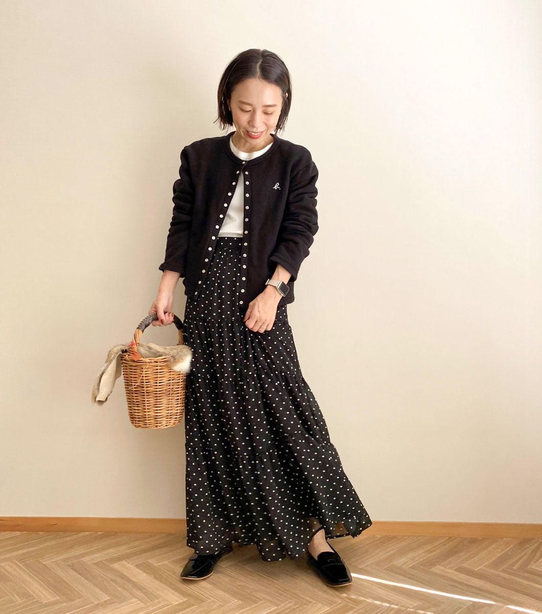 カーディガンとスカート、足元まで黒のワントーンでまとめた大人カジュアルスタイル。