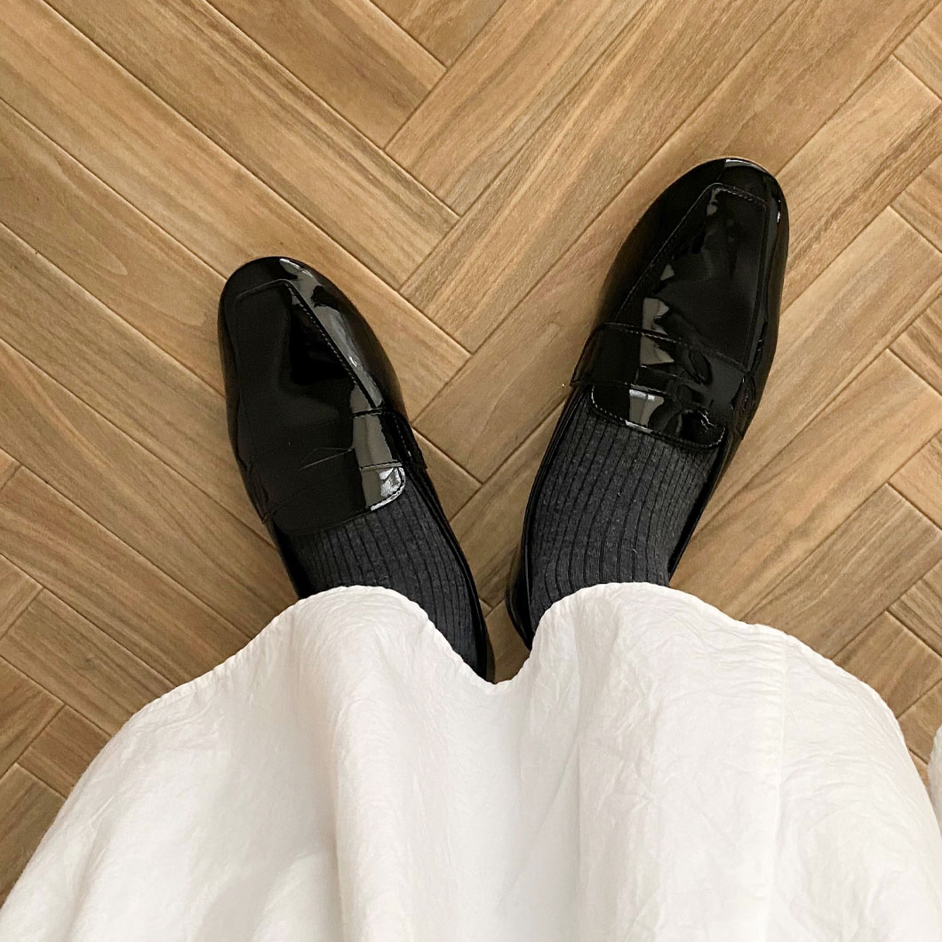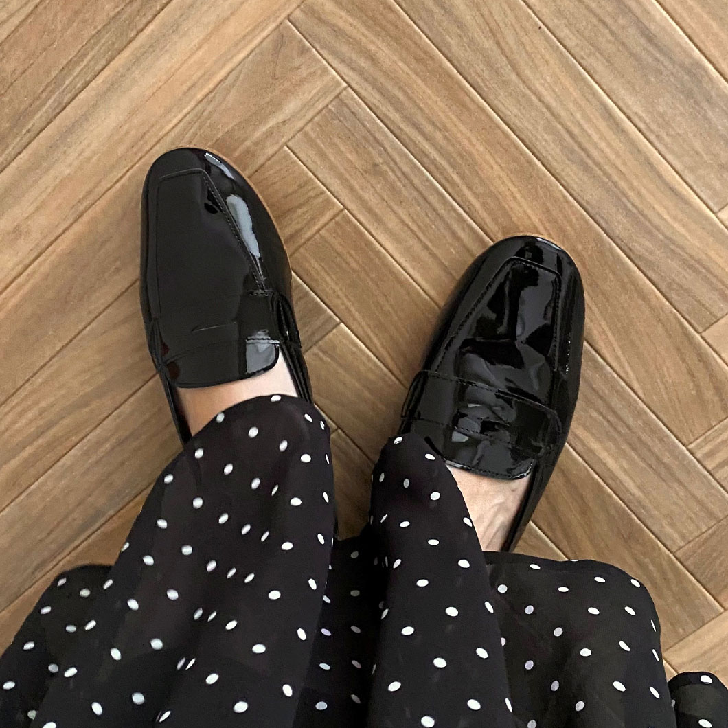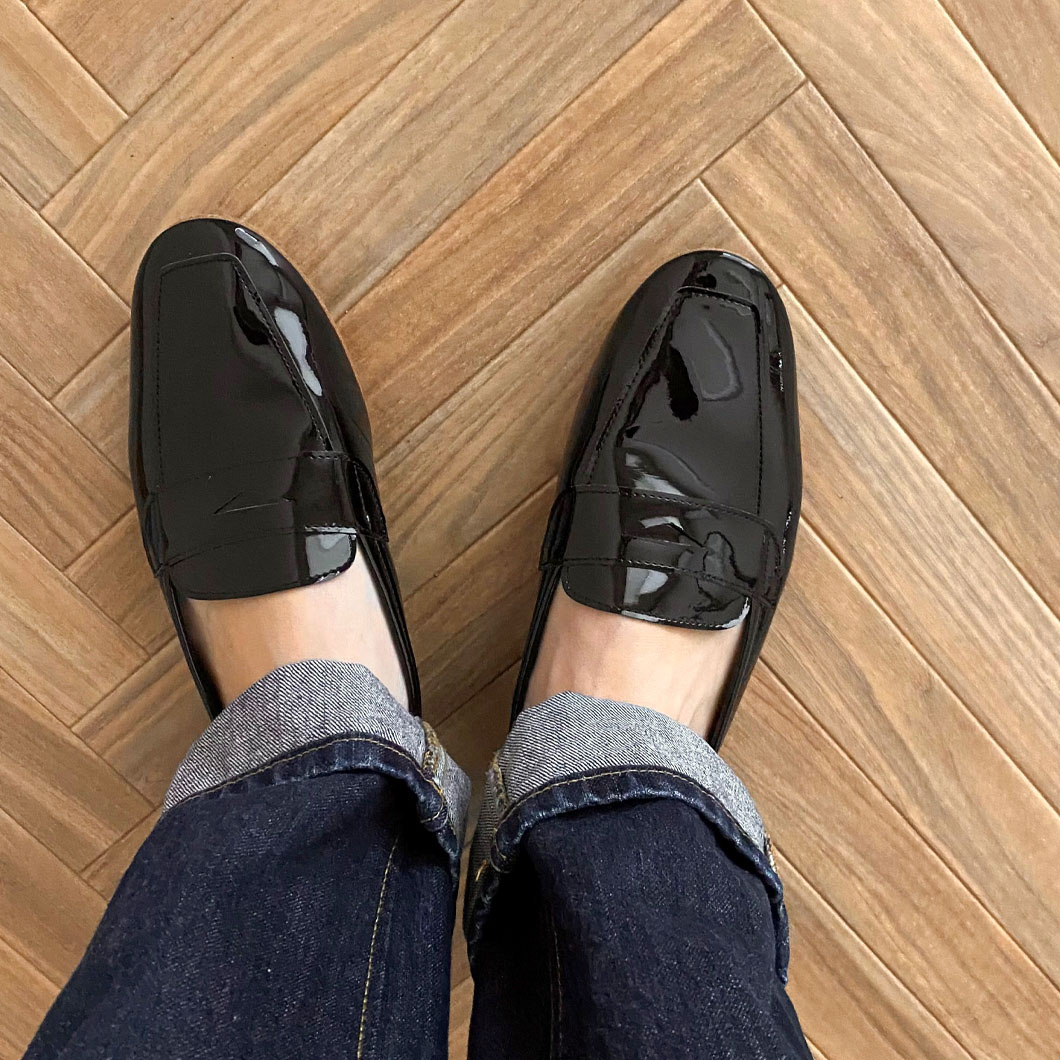 上半身にボリュームがあるので、足元は細身シルエットのエナメルローファー「ジェシカ」ですっきりとまとめました。