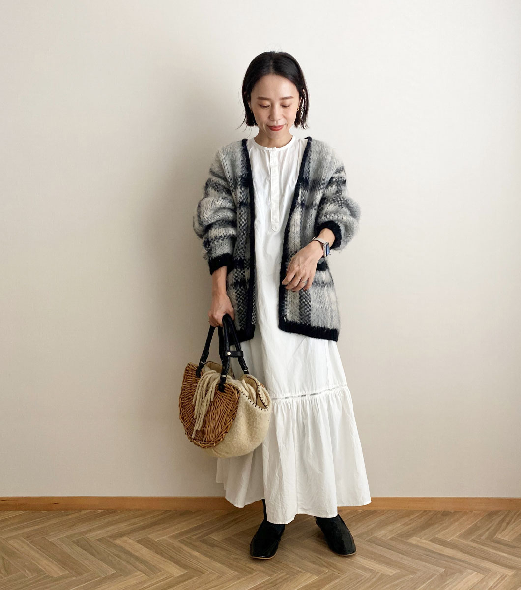 モノトーンのコーディネートでもモードになりすぎない、優しい雰囲気のかごバッグもポイント〇