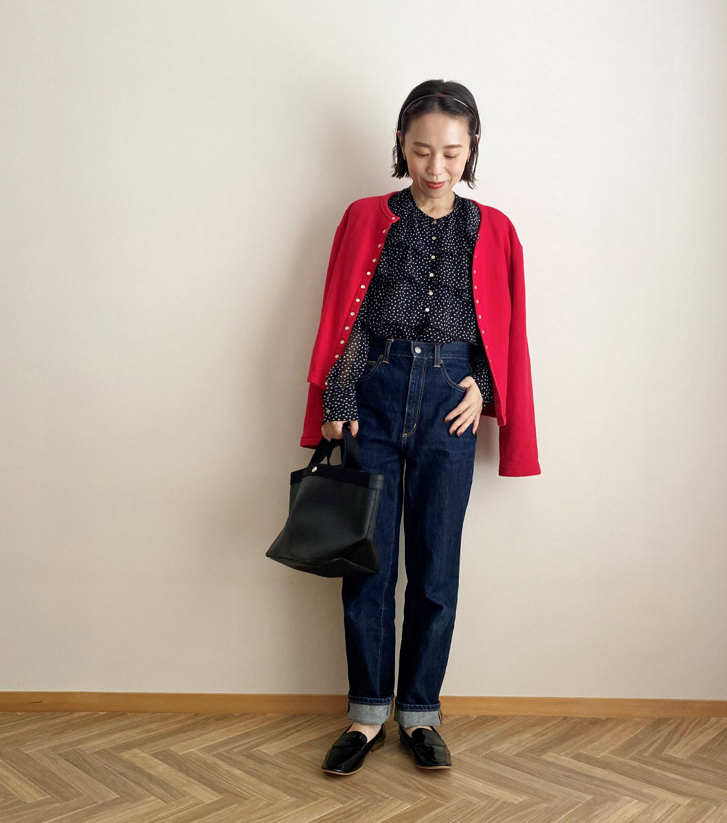 赤のカーディガンを肩掛けしてパリジェンヌ気分♡