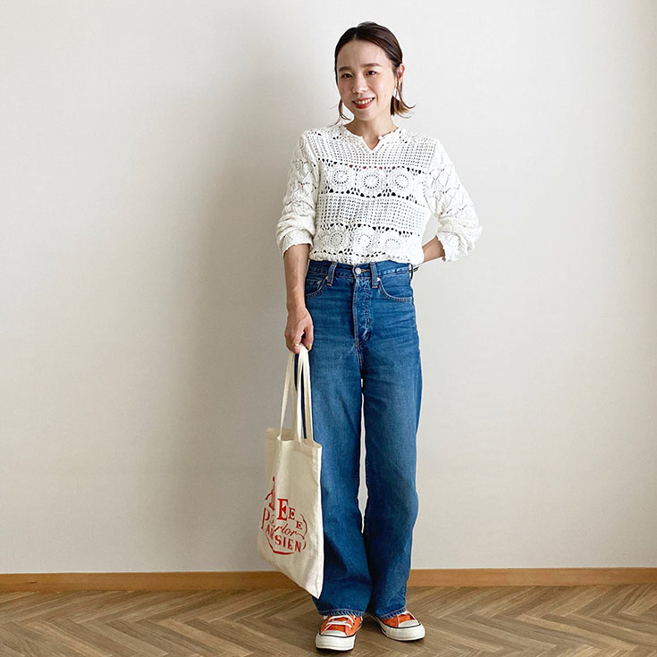 ハイウエストデニムにトップスをインすると腰位置が高くスタイル良く見えます◎