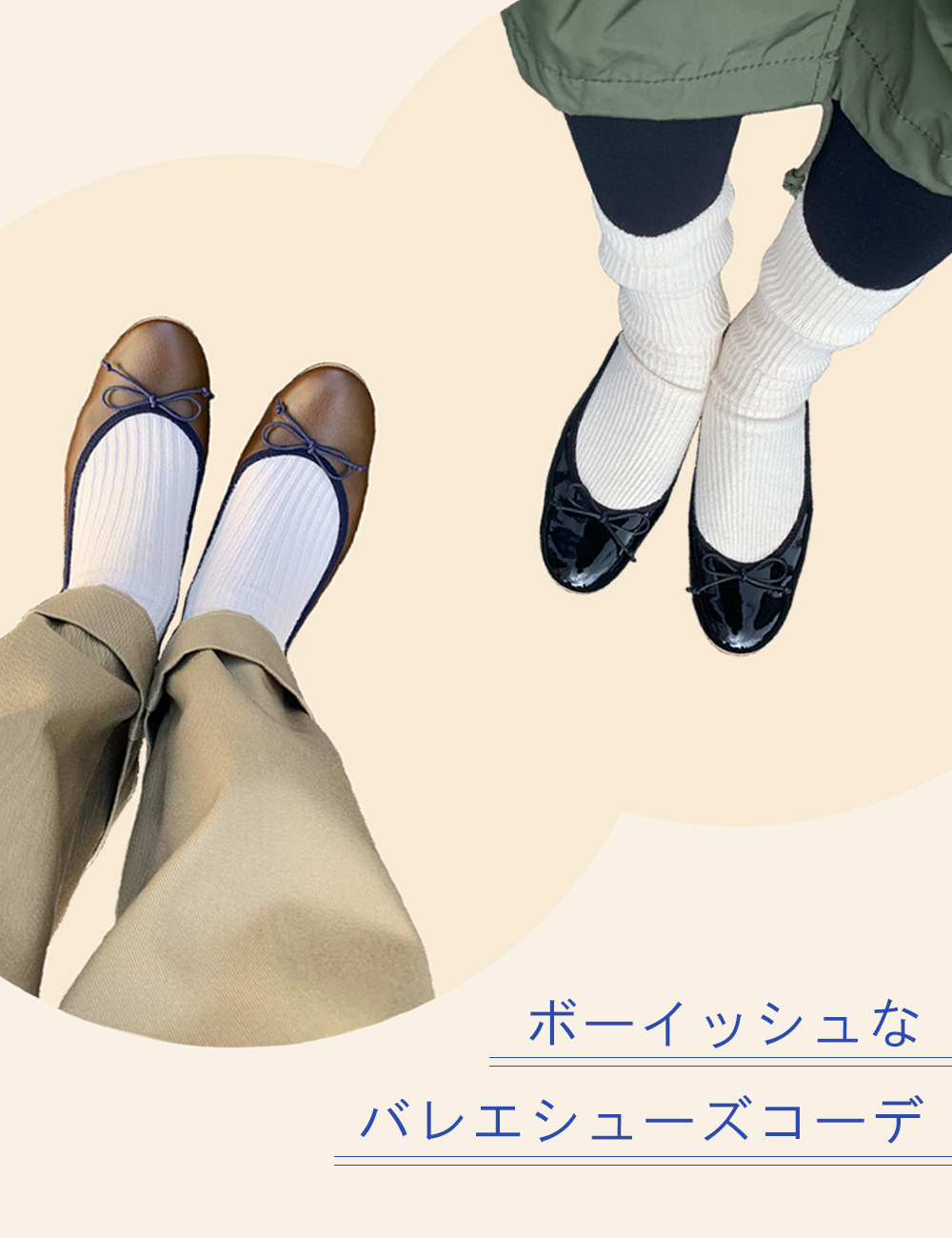 タイツとバレエシューズの足元コーディネートの時には、白系の靴下を合わせてカジュアル感を。