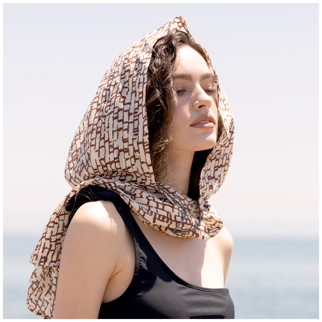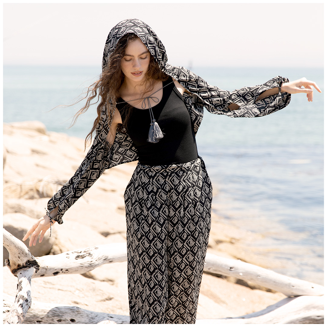「ボーホーストール」はフード付きだから、直射日光から首や肩を守ってくれて安心。