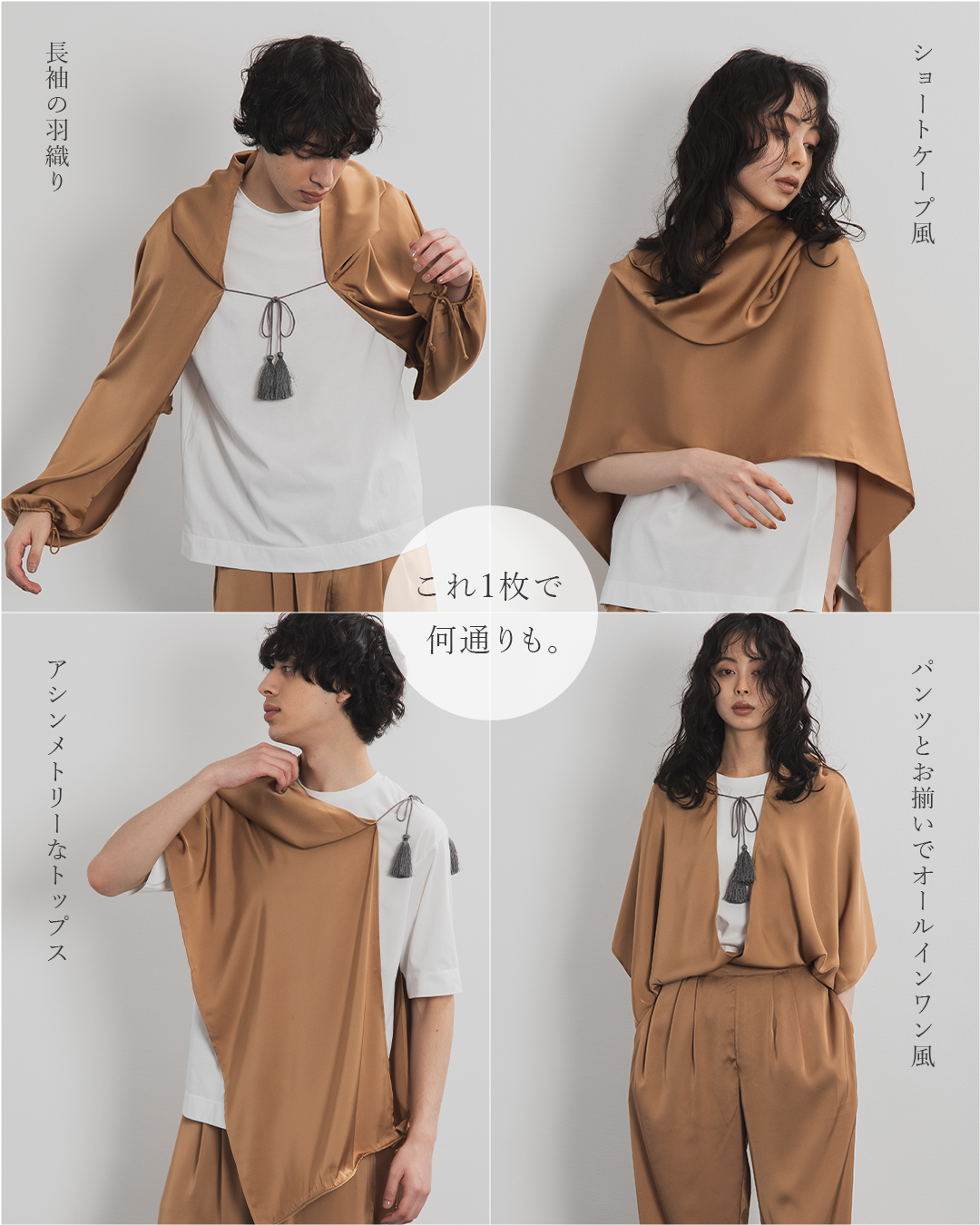 長袖の羽織り、ショートケープ風、アシンメトリーなトップス、ジャンプスーツ風…変幻自在な活用法を動画でチェック。