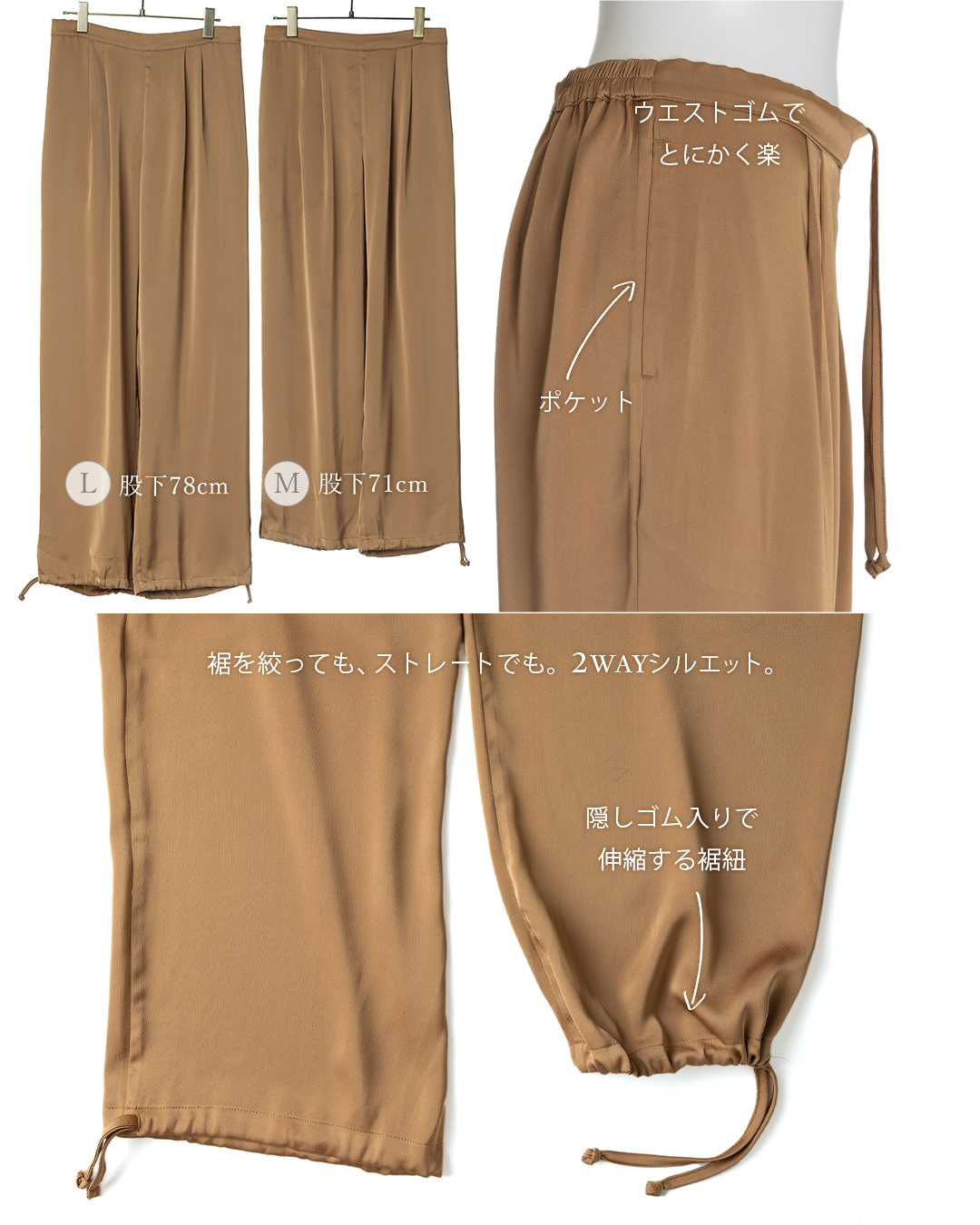 身長に合わせて丈を選べるし、ワイドストレート×裾絞りの2WAY仕様で、膝までたくし上げてもOK。突然の雨も軽快に。