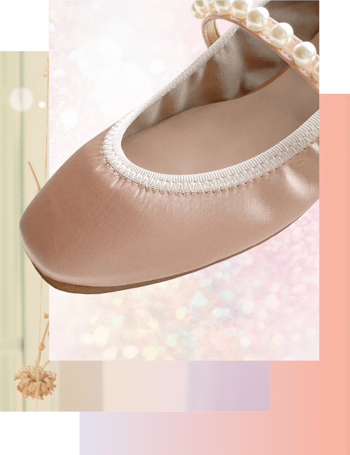 ストレスフリーな履き心地が年代問わず人気のスクエアトゥバレエシューズをもとに、アッパーには上品な光沢のピンクベージュのサテン生地を使用。