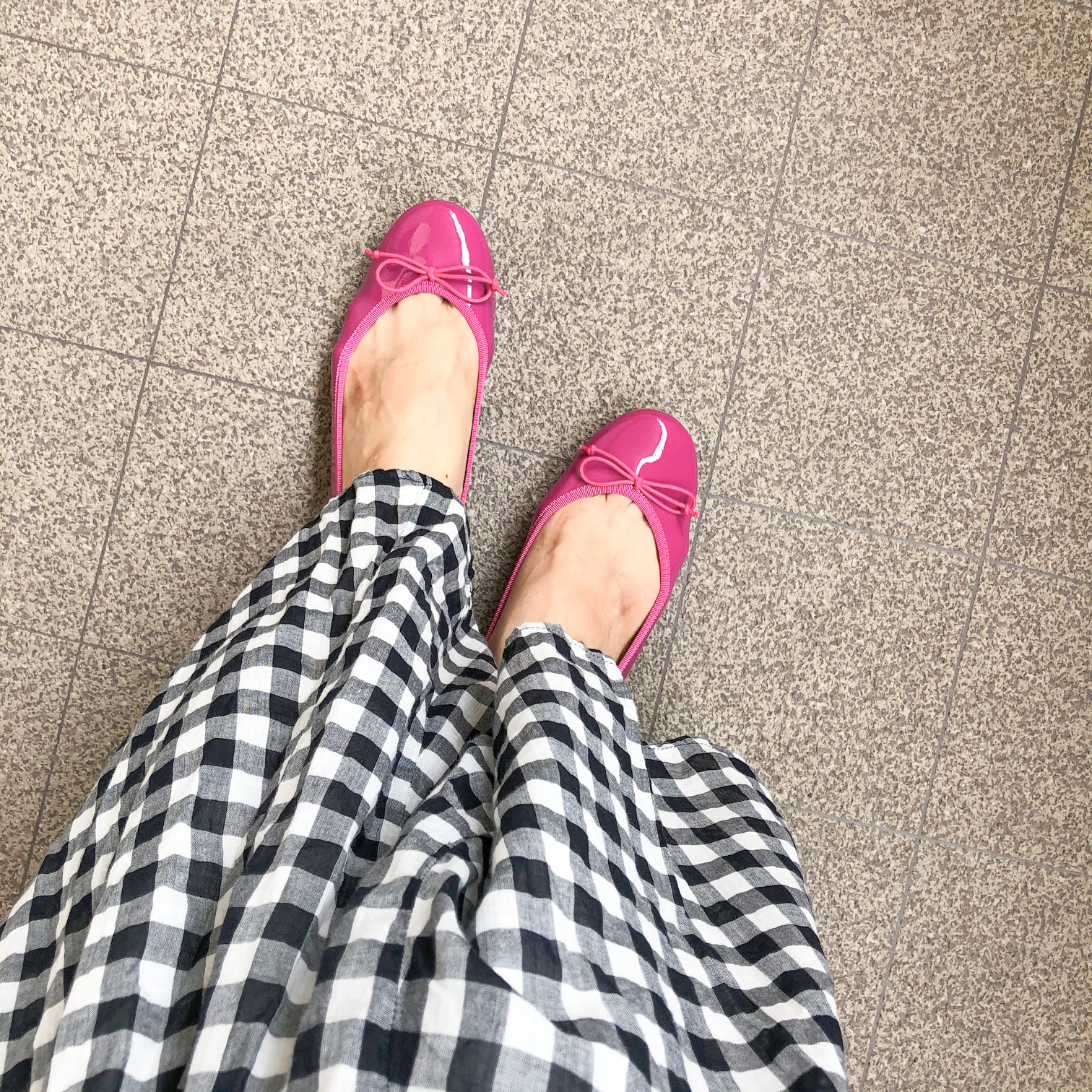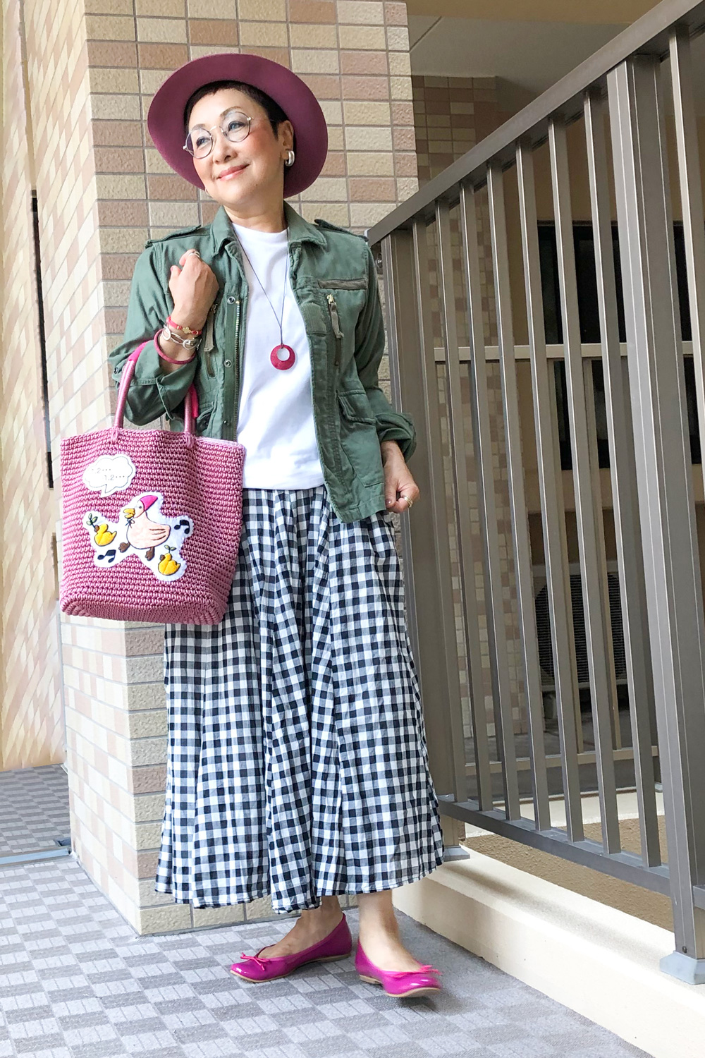 今年、大流行!旬のミリタリーも、ギンガムチェックのギャザースカートとショッキングピンクのフラットシューズで大人の甘さをプラス。