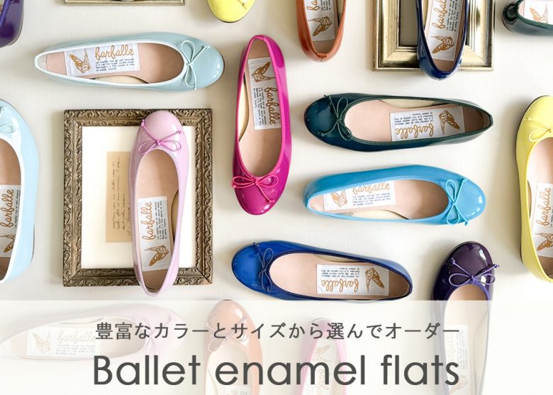 定番のエナメルバレエは受注生産を含めて、33サイズ(21.5cm)~42サイズ(26cm)の10サイズ、全20色のカラーからお選びいただけます。