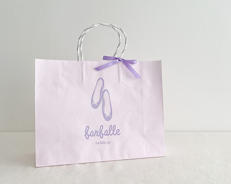 ご購入の際、ギフト資材をあわせてお選びいただきますと、たくさんのお客さまから「かわいい!」と好評のファルファーレオリジナルショッパーにリボンを付けて発送させていただきます。